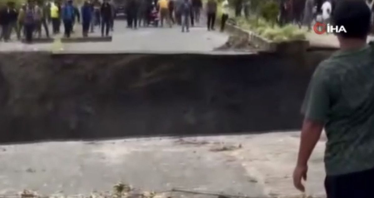 Endonezya’da etkili olan şiddetli yağışların yol açtığı sel ve toprak kaymalarının ardından 4 şeritli bir yolda çökme meydana geldi. Vatandaşlar ölümden kıl payı kurtuldu.